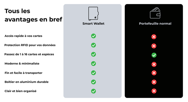 Avec un espace pouvant contenir jusqu'à 16 cartes et billets, le Smart Wallet est votre compagnon idéal au quotidien et en voyage.