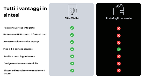 L'Elite Wallet è l'evoluzione dei portafogli moderni. Minimalista, sicuro e intelligente. Grazie allo slot AirTag integrato, puoi tenere sempre d'occhio il tuo portafoglio tramite Apple Find My.