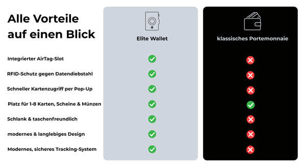 Die EliteWallet ist die Weiterentwicklung moderner Geldbörsen. Minimalistisch, sicher und smart. Mit integriertem AirTag-Slot behältst du dein Wallet jederzeit im Blick, einfach über Apple Find My.