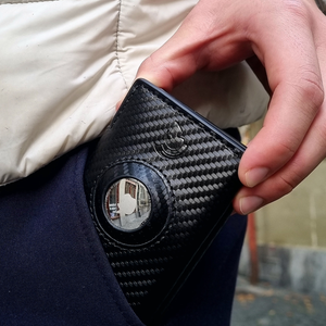 Bild wird geladen: SPARTANHUB Elite Wallet – RFID-geschütztes Elite Wallet in Carbon-Optik mit AirTag-Halterung, gehalten in Hand.